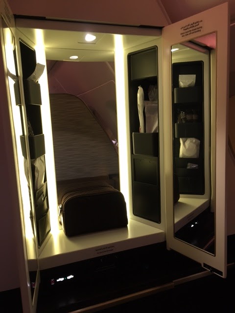 Um dos melhores resgates que eu considero do programa AAdvantage foi esse que eu realizei, e se traduz em algo muito mais do que um simples voo, e passa a ser uma tremenda experiência. O voo que eu realizei foi de Sydney na Austrália para Abu Dhabi nos Emirados Árabes Unidos por 60 mil milhas do AAdvantage em Primeira Classe, que nessa rota por ser um A380 é conhecida como “Apartamento”. É também nesse avião que tem a residência, que foi ao lado do meu assento, a qual tivemos acesso por um breve momento, mas a chefe de cabine não permitiu fotos e alegou ser política da empresa.