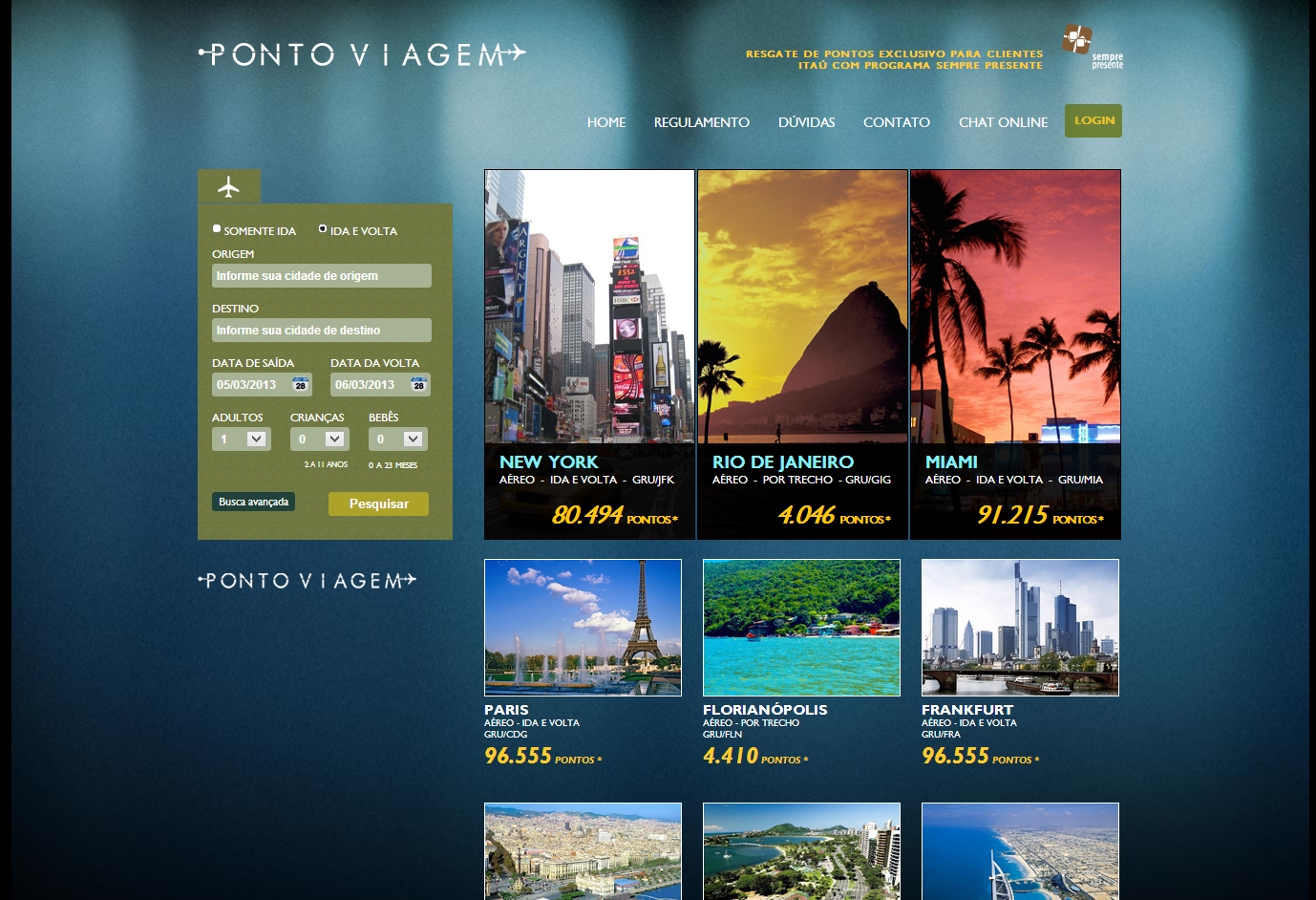 A partir de hoje começa a valer o novo programa do Itaú, o Sempre Presente. O programa original sofreu alterações que trouxeram grandes desvantagens para o resgate de pontos. Primeiramente, as milhas, que antigamente não expiravam, agora tem data de validade de acordo com o tipo de seu cartão de crédito em torno de 24 ou 36 meses. Segundo, ao invés de transferir os pontos para os programas de milhagem, os clientes deverão acessar o portal de viagens do programa para resgatar diretamente o trecho desejado com a companhia que quiser, o que é até uma boa coisa, pois deste modo permitirá ao cliente que voar desta forma acumular milhas qualificantes e para resgate, utilizando assim seu programa de milhagem preferido, porém os valores de pontos para resgate das passagens são exorbitantes. E por fim, em virtude de tudo isso, os pontos do programa sempre presente deixam de ter o valor que tinham, diminuindo assim o seu poder de resgate com o saldo que você acumulava pelo seu gasto no cartão de crédito. Não deixe de conferir o novo portal de viagens do Itaú no link abaixo.