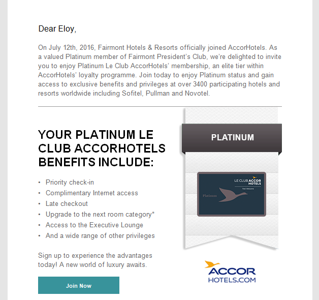 Seguindo o programa de fidelidade da Rede Fairmont, desde hoje, dia 20 de Outubro de 2016, o Le Club está fazendo match para os clientes de categoria elite do Fairmont President Club, embora eu não ache muita vantagem, mas melhor ser Platinum do que não ser nada se necessário for se hospedar na Rede Accor. No entanto esse match para ser direcionado, pois somente quem receber o email do Fairmont está apto a solicitar a equivalência de categoria, com isso já se vê um alinhamento dos dois programas que irão ter reciprocidade de benefícios elite. Vou colocar o link abaixo, mas não sei se funcionará para quem não recebeu o email. Boa Viagem.