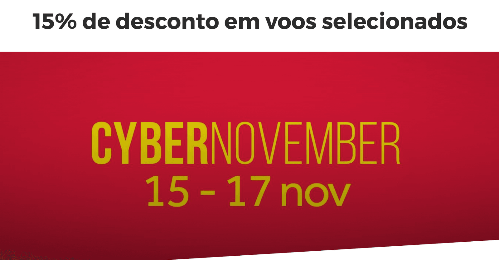 O código do cupom é CYBER15 e você pode aplicar ele diretamente na página oficial clicando aqui. Ele é válido até o dia 17 de Novembro de 2019. Os voos válidos são:
