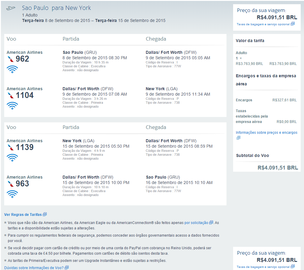 A American Airlines está com excelente preços para a classe executiva. Por que é bom optar por gastar um pouco mais e viajar na executiva? Primeiramente pelo conforto de viajar em uma cabine premium de serviço superior, e em segundo pelos benefícios do programa de fidelidade. A American Airlines hoje está com duas promoções muito boas para a compra de passagens em classe executiva, sendo a primeira você ganhando mais milhas bônus, e a segunda dobrando o número de pontos para que você possa atingir um status elite de forma mais rápida, então vale a pena desembolsar um pouco mais, até porque a diferença nesse caso fica muito pouca em comparação com a classe econômica. Essa tarifa tem validade limitada, logo pode acabar a qualquer momento. Em um momento de dólar alto, esses valores estão muito bons para compra. Conseguimos achar vários destinos, e outros não limitados a esses listados abaixo. A seguir colocamos alguns exemplos que podem ser achados entre os meses de Setembro e Outubro, a saber: