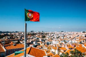 Portuguese flag and Lisbon skyline, Portugal
