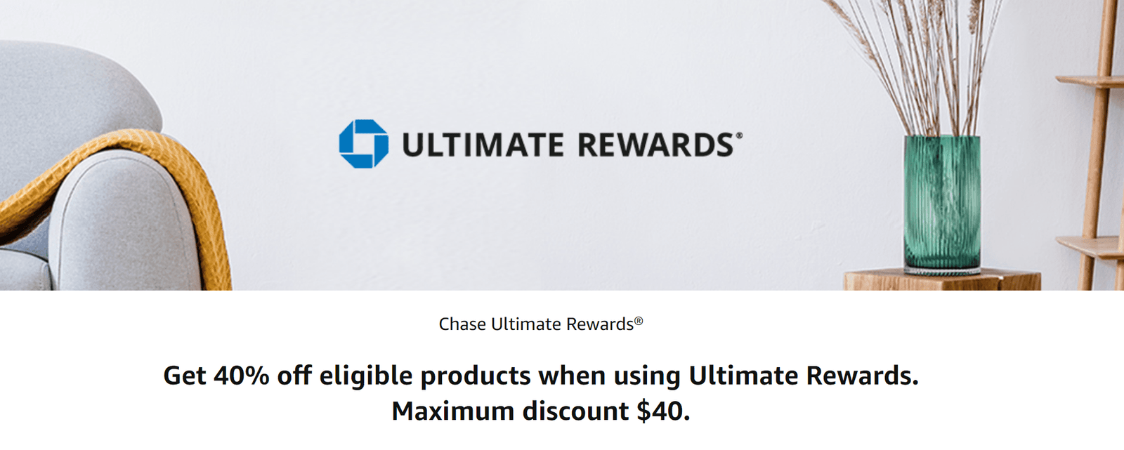 A Amazon americana está com uma excelente promoção em parceria com os cartões de crédito do Chase que pontuam no Ultimate Rewards. Você receberá 40% de desconto até um máximo de 40 dólares.