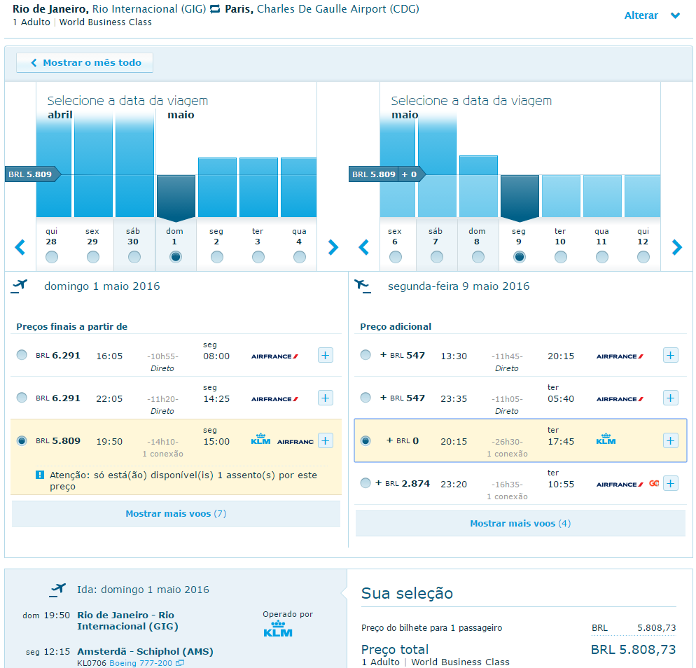 Essa é uma excelente promoção para o mês de maio com a KLM. O preço normal de uma classe executiva para a Europa varia entre 8 e 12 mil Reais a depender da data e do destino, no entanto a KLM, que tem um assento fantástico dentre as cias que viajam para a Europa está com uma promoção saindo do Rio de Janeiro e indo para Paris por apenas 5.800 Reais já com os encargos e taxas inclusas. Então antes de você achar que está caro porque viu em outro site por 4.400 Reais, lembre-se que é necessário adicionar os encargos, impostos, e a comissão do site, e veja quanto fica o preço final. Além disso, nessa cia áerea você pode enviar as milhas para o Flying Blue, Delta Skymiles ou Smiles. Eu acho esse valor muito interessante para quem precisa ir para a Europa e quer viajar de Business, já que a econômica sai por pouco mais da metade desse valor, e o serviço de bordo da KLM é altamente reconhecido no mundo inteiro. Caso seja do seu interesse segue o link abaixo que irá te redirecionar para a página oficial da promoção. Lá clique na aba “World Business Class”, e então Paris. Tenha a certeza de que o aeroporto de saída é o GIG, caso contrário poderá haver discrepância nos valores. Boa Viagem.