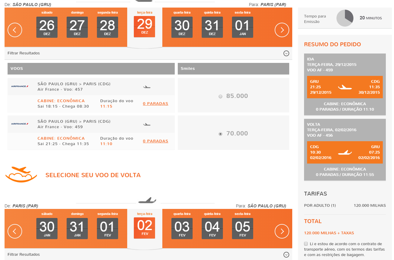 A partir de amanhã dia 25 de Junho e até o dia 27 de Junho o Smiles estará vendendo milhas com 200% de bônus, ou seja, você receberá o triplo de milhas do que comprou, que nesse caso permite você um acúmulo de 120 mil milhas pelo preço de 2.800 Reais. Ou seja, com essas milhas é possível ir para Paris no período de Réveillon, que é altíssima temporada, diga-se de passagem. Você pode ver na captura de tela abaixo a amostra, pena que só dá pra conseguir na classe econômica, mas já é algo, uma vez que os valores para essa época do ano são estratosféricos. Tá aí sua chance de passar um Réveillon em Paris gastando pouco, e caso já possua algumas milhas smiles extra pode até mesmo considerar ir ou voltar de classe executiva. Essa é uma boa promoção de compra de milhas, sendo difícil achar no mercado de fidelidade algo parecido onde você compra uma e recebe em triplo a quantidade. Como sempre não deixe de ler as regras, que pode ser acessada pelo link oficial disponibilizado abaixo. Boa Viagem!