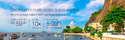 A Azul lançou uma ótima promoção com tarifas nacionais a partir de 59,90 Reais. São vários destinos e origens, e todas acumulam pontos no programa Tudo Azu, e além disso você pode parcelar essas passagens em até 10x sem juros. Se você ainda tem o cartão Tudo Azul Itaucard ainda recebe 10% de desconto nessas passagens. Veja abaixo as regras, e caso seja do seu interesse clique no link abaixo para ir direto na página oficial da promoção da Azul. Boa Viagem.