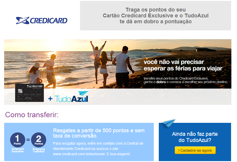 A Azul acaba de lançar outra promoção de pontos em dobro para clientes Credicard. A promoção é válida para transferência de pontos realizadas até o dia 31 de maio de 2014, logo, corra, pois você tem somente 5 dias antes que essa promoção acabe. Não entendi porque a Azul demorou a divulgar essa promoção, dando praticamente 5 dias para os clientes do cartões Credicard receberem essa bonificação, mas de qualquer forma está aí, e não deixa de ser uma boa promoção. Para maiores detalhes sobre as regras da promoção clique no link abaixo, que te levará até o site oficial da promoção. Aproveite mais essa, e faça uma Boa Viagem!