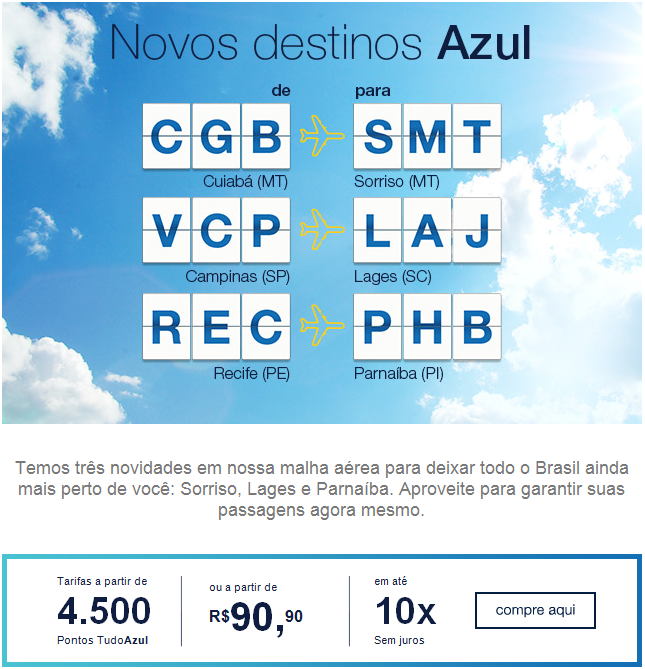A Azul acaba de lançar 3 novos destinos, e com valores a partir de 90 Reais, ou 4.500 pontos, que no caso acho desperdício em virtude do valor baixo da passagem. As novas rotas são Cuiabá a Sorriso no Mato Grosso, Campinas a Lages, em Santa Cantaria, e Recife a Parnaíba. A Azul vem se expandindo de forma constante e sustentável no Brasil, o que é muito bom. Para não perder essa promoção de lançamento clique no link abaixo para ser direcionado à página oficial da promoção. Boa Viagem!