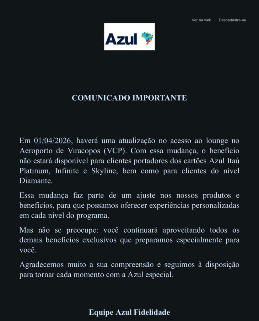 A Azul enviou um comunicado por e-mail aos seus clientes sobre uma futura limitação no acesso ao seu lounge VIP no aeroporto internacional de Campinas (VCP). Os clientes portadores dos cartões Azul Itaú cobranded e os clientes da categoria Diamante não mais poderão ter acesso ao lounge.