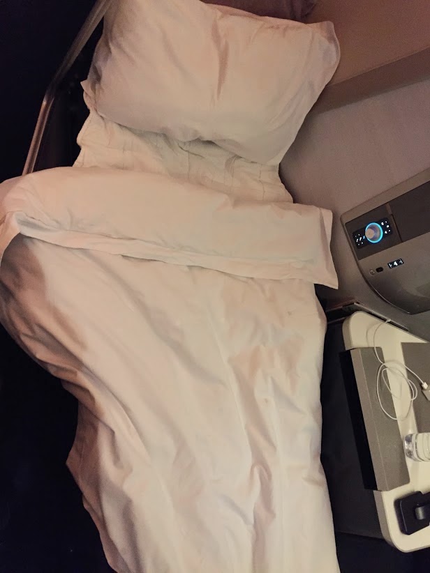 Após o jantar à bordo, a aeromoça arrumou o assento de forma a virar cama em horizontal completa de 180 graus. Esse assento é um dos melhores assentos na minha opinião no que tange as primeiras classes das cias aéreas. Para viajar nessa cabine você pode utilizar 90 mil milhas do AAdvantage ou Avios. ou ainda 140 mil pontos Multiplus