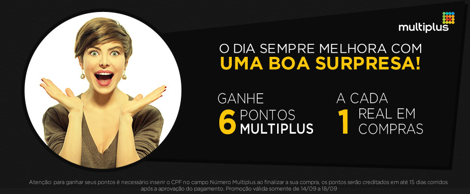 Entrou no ar hoje uma super promoção surpresa das Lojas Ponto Frio e Zattini, ambas parceiras do Multiplus em que estão dando considerável pontuação para compras realizadas até o dia 18 de Setembro de 2016. O Ponto Frio está oferecendo 6 pontos a cadas Real gasto, o que é bom. Sabemos que já tivemos ofertas melhores como 9 pontos por real gasto na semana passada, mas 6 pontos por real não deixa a desejar, principalmente para aqueles que tem a necessidade de realizar alguma compra no estabelecimento.