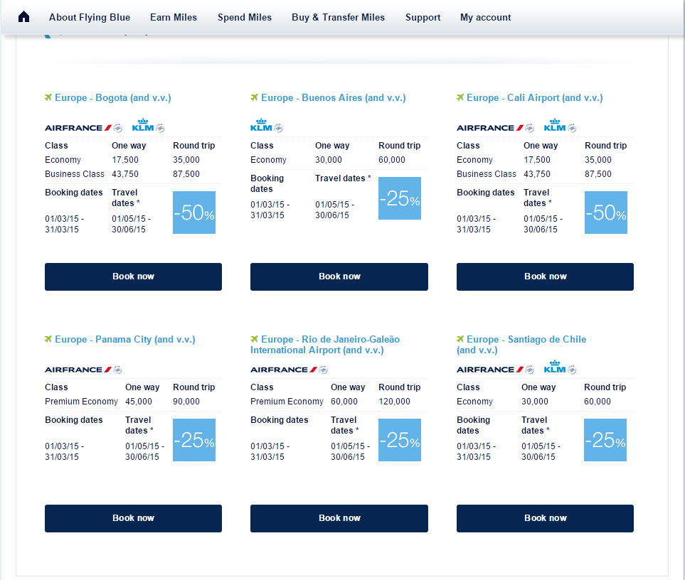 O Programa Flying Blue, da Air France e KLM, durante o mês de março está com uma promoção de e para o Rio de Janeiro com a Europa, onde será possível emitir bilhetes prêmio com 25% de desconto para a classe Econômica Prêmio. Para poder aproveitar essa promoção é necessário a emissão do bilhete até o dia 31 de Março de 2015 para viajar entre 1º de Maio e 30 de Junho de 2015. É claro, que a promoção da TAP na postagem abaixo é muito melhor, onde é possível emitir passagens para a Europa em classe executiva por apenas 100 mil pontos ida e volta, enquanto que a Air France está cobrando aqui 120 mil pontos ida e volta para a econômica prêmio, mas nem todos tem milhas somente na TAP, e para quem tem milhas no programa Flying Blue pode ser uma oportunidade de viajar na econômica prêmio da Air France que não é tão ruim assim. Além disso, neste momento, não está difícil encontrar disponibilidade, principalmente para o mês de Julho, alta temporada para brasileiros que viajam para a Europa. Espero que essas notícias possam estar trazendo opções para você, e caso deseje maiores informações, por favor clique no link abaixo para ser redirecionado para a página oficial da promoção. Não perca essa oportunidade caso sirva para o seu planejamento. Boa Viagem!