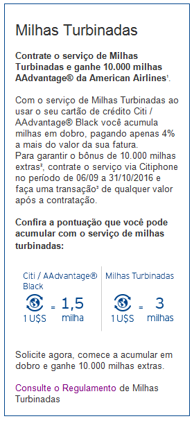Os Cartões Citi estão com uma boa promoção, porém com uma pegadinha. Caso você contrate o serviço de acelerador, que cobra 4% a mais para dobrar a fatura, você receberá 10 mil pontos no programa AAdvantage. De acordo com os termos e regulamentos esses pontos no entanto serão somente depositados 60 dias após o término da promoção, que será dia 30 de Outubro, ou seja, te obrigando a pagar 2 faturas no mínimo com o acelerador, que não considero um bom negócio em virtude do alto valor do dólar no momento atual. Então recomendo a quem tenha interesse nessa promoção que contrate 2 dias antes do final da mesma, por volta do dia 28 de Outubro de 2016, e logo que receber os 10 mil pontos aadvantage solicite o cancelamento do acelerador de pontos. Para receber o bônus a contratação precisa ser feita pela central do cliente até a data mencionada acima. Como essa promoção foi comunicada em email, e não conseguimos achar o link oficial para a mesma estamos apenas divulgando a cópia de tela do email oficial do Citi. Boa Viagem.
