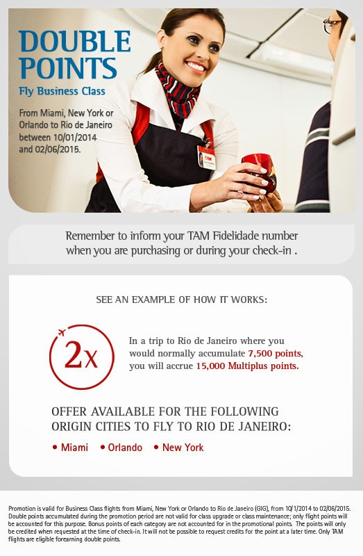 Mora nos EUA? Está pensando em visitar o Brasil? Saiba que a TAM está dando o dobro de milhas para aqueles que viajarem para o Rio de Janeiro a partir de Miami, Nova York, e Orlando. A promoção também só vale para a classe executiva, e vai de 1 de Outubro de 2014 até 06 de Fevereiro de 2015, um período considerável. Não existem restrições de residência, ou seja, se você for Brasileiro, e estiver viajando dos EUA para o Brasil naqueles destinos especificados receberá o dobro de pontos, caso faça o vôo em classe executiva. Só não entendi porque a TAM não faz a promoção de forma recíproca, pois desta forma prestigia o viajante estrangeiro, do que o nacional onde a empresa tem extensa malha aérea, mas deve ser o fluxo que está baixo. Você só consegue tomar ciência dessa promoção se acessar o site americano da TAM. Caso se encaixe nos seus planos, é uma boa! Boa Viagem!