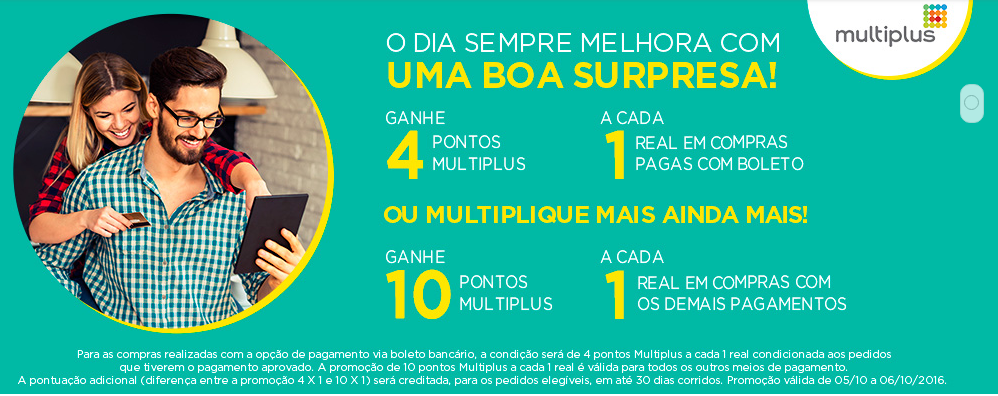 Super dica do leitor Bruno Bonela, que nos apontou essa super promoção da Ponto Frio para compras realizadas até amanhã dia 6 de Outubro de 2016, em que todas as compras irão dar 10 pontos por real, com exceção daquelas pagas no Boleto, que então irão pontuar 4 pontos por real. Para quem já está com planos de compra ou pretendia comprar algo no futuro a hora é agora, pois uma compra de 1 mil reais por exemplo vai te garantir 10 mil pontos multiplus o que é considerável. Lembre-se de acessar o site específico para essa promoção pelo link abaixo, caso contrário você irá pontuar no padrão de 1 ponto por real. Então se for do seu interesse clique no link abaixo, que irá te redirecionar para o site oficial promocional. Boas Compras, e depois Boa Viagem.