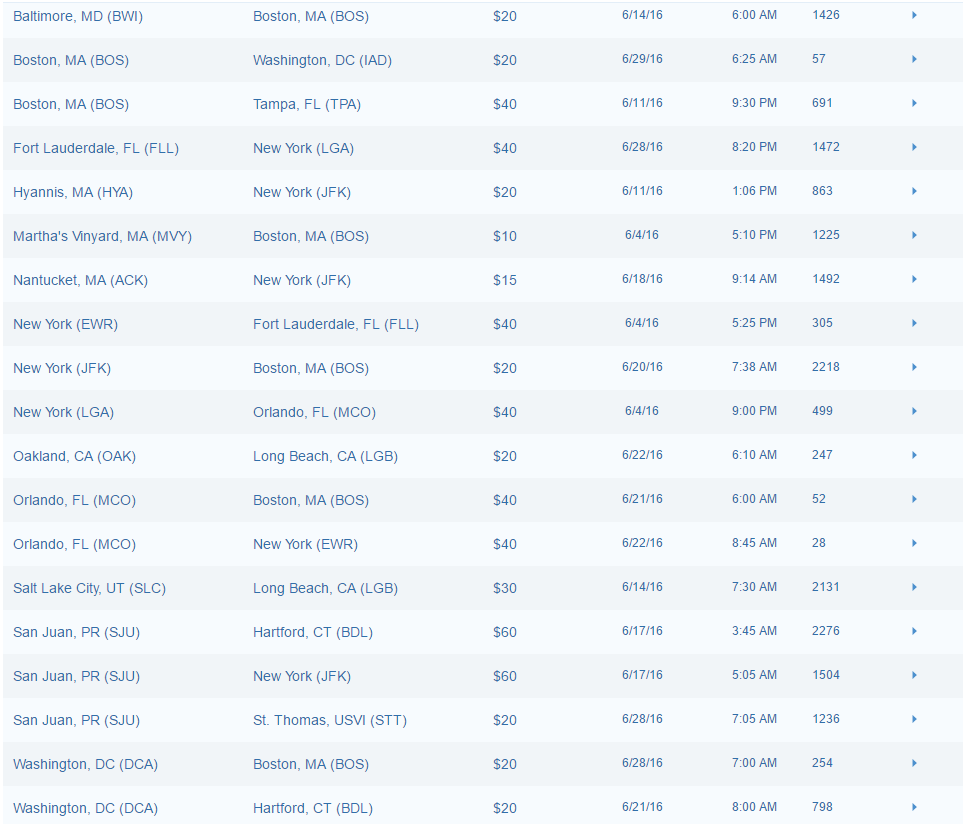 A Jetblue é uma excelente opção para voos regionais nos EUA. Muita das vezes é mais barato chegar por exemplo em Dallas, Houston ou Fort Lauderdale, porém a conexão para Orlando, Boston e Nova York (Hubs da JetBlue), encarecem por demais a passagem aérea. Então para quem faz voos internos,  é muito bom contar com uma cia aérea low cost com a JetBlue, e até 20h horário de Brasília hoje, dia 2 de junho é possível comprar passagens a partir de 10 dólares americanos. Mesmo com essa tarifa ainda é possível pontuar no programa de fidelidade da empresa, o True Blue. Você pode acessar a página oficial da promoção pelo link abaixo. Também colocamos uma captura de tela de alguns exemplos de tarifas e destinos. Boa Viagem!