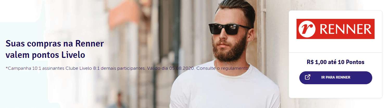 [dropcap]A[/dropcap] Livelo está oferecendo o acúmulo de até 10 pontos por real em compras realizadas na Renner, maior varejista de moda do Brasil. Clientes Clube Livelo contam com o acúmulo de 10 pontos a cada real gasto e são 8 pontos para os demais clientes, apenas nesta quarta-feira (5).