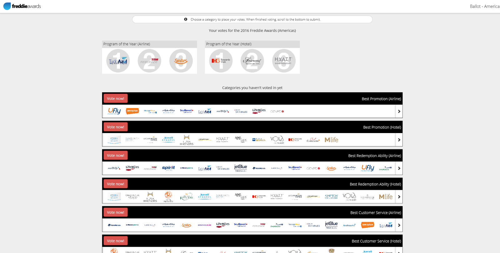 Para votar no Freddies de 2016 basta cadastrar seu email, e proceder a votação. O site para votação está disponibilizado no link abaixo. Posso estar enganado, mas até o presente momento somos o único Blog brasileiro que estamos divulgando tal premiação, e não entendo o motivo pelo qual os demais não o fazem. Essa é a premiação mais importante do mundo para a categoria de programas de fidelidade, e é muito mais importante receber um prêmio Freddie do que ser o mais votado em enquetes de outros sites, por mais acessos que aqueles tenham. Não quero aqui desvalorizar nenhum levantamento nacional, mas sim indicar a importância dessa premiação para o mundo dos programas de fidelidade, tanto é que caso você acesse o site das três maiores empresas americanas, todas, sem exceção estão pedindo para você votar nelas nessa premiação, coisa que você não vê no Brasil!
