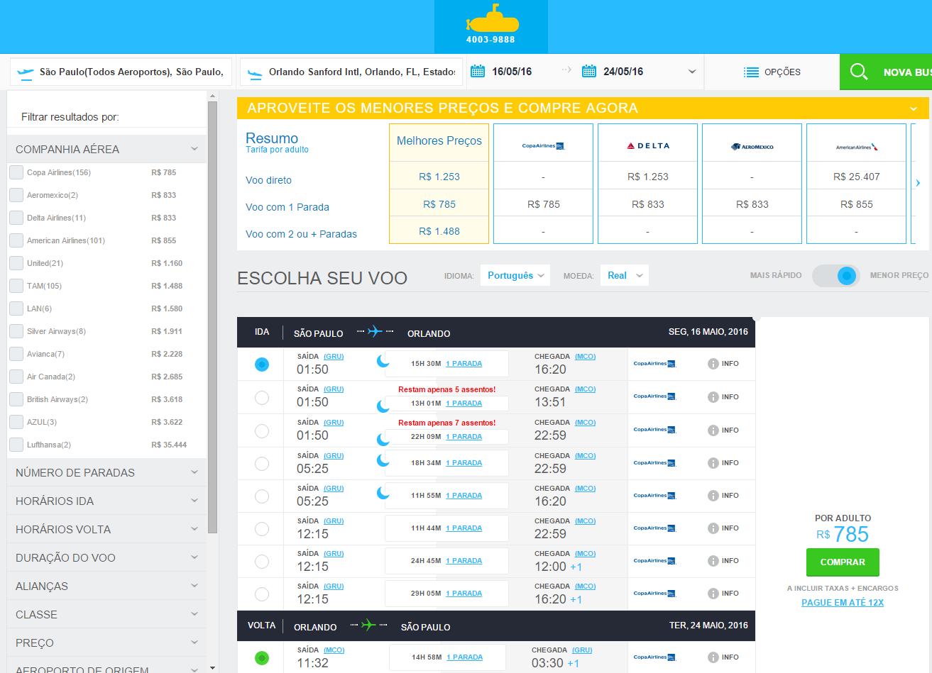Vale ressaltar que Orlando com a American por 1.300 Reais está muito bom, principalmente para acumular milhas antes da mudança do programa. São 9 mil milhas para quem não tem status, podendo chegar a 18 mil para quem é Platinum ou Executive Platinum, sem contar que é um excelente destino. É muito difícil achar algo bom assim no portal do submarino viagens, mas me surpreendeu dessa vez. Caso seja do seu interesse clique no link abaixo que será redirecionado para a amostra que fizemos no mês de maio. Boa Viagem!