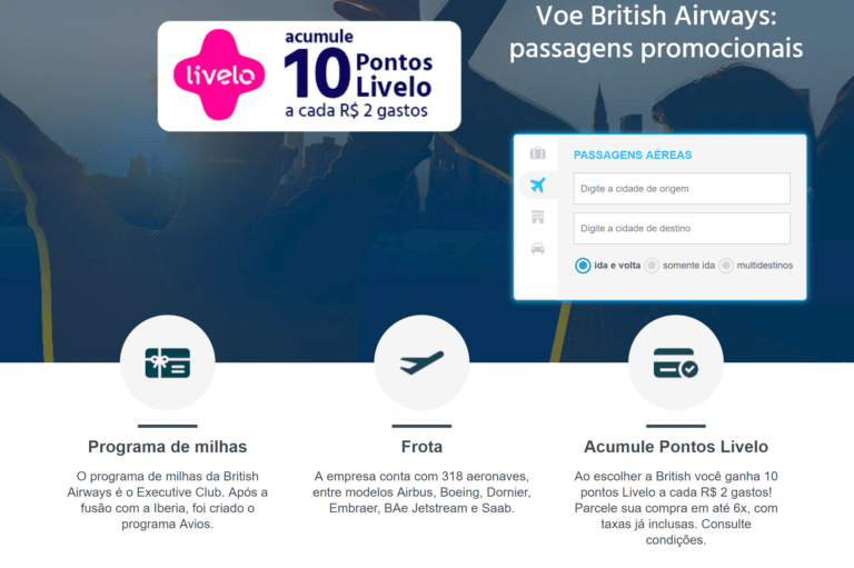 [dropcap]S[/dropcap]omente até dia 9 de Agosto de 2019, quem comprar passagens da British Airways e Iberia via Submarino Viagens irá receber 5 pontos livelo por real. Para quem precisa comprar...