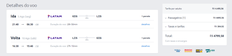 [dropcap]O[/dropcap] Site Edestinos está com um excelente valor para viajar para Lisboa por 4.800 reais em classe executiva ida e volta com a Latam. Achamos esses voos pelo Google Flights....