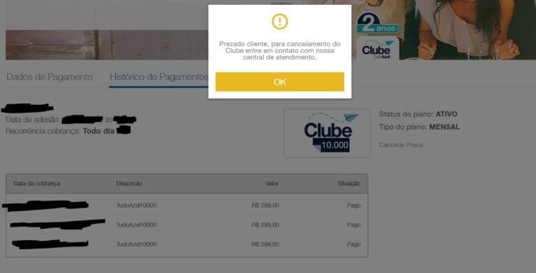Agradecemos ao leitor João pela informação em primeira mão. Recebemos alguns relatos de que o Clube TudoAzul não está sendo possível seu cancelamento online, seguindo a mesma estratégia da Multiplus...