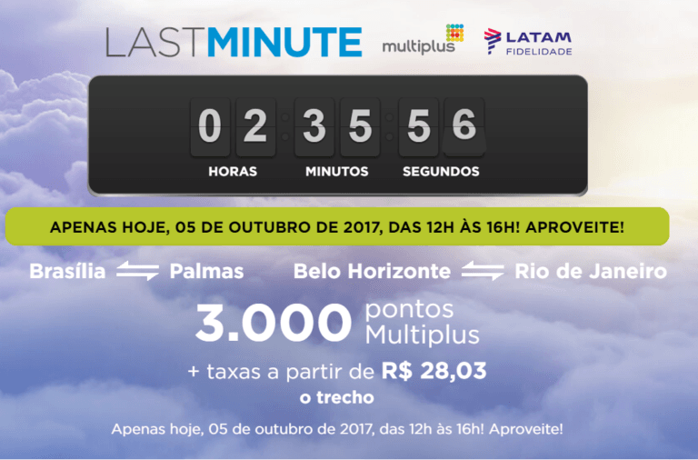 [dropcap]F[/dropcap]altam menos de 3h para a promoção relâmpago da Multiplus terminar. Essa é uma nova promoção relâmpago chamada de “Last Minute”, em que tem passagens em várias rotas do Brasil...