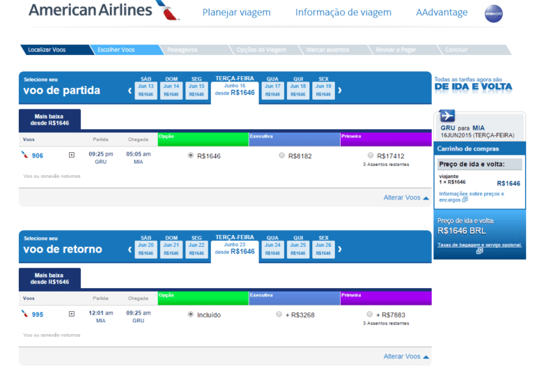 A American está oferecendo neste momento São Paulo a Miami por 1646 Reais, considerando o dólar de hoje, a tarifa está em torno de 500 dólares americanos com encargos e...