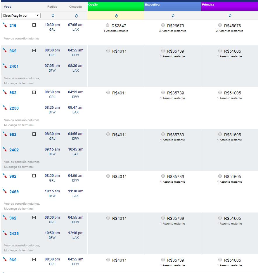 Olhando passagens na internet aconteceu uma coisa curiosa, escolhi uma ida e no momento da volta me foi oferecido a diminuição do valor, com isso consegui achar uma passagem para Los Angeles por apenas 1.593 Reais em plena época de feriadão, ou semana do saco cheio. Lembro que Los Angeles é onde está a Disneyland, Adventureland, Universal Studio City, e muitas outras atrações. Pelo que vi no inventário do voo só existem mais 9 assentos com esse valor, e você ainda acumula 13 mil milhas. Acho que para quem pretende ir para os EUA nesse feriado e não tinha conseguido encontrar valor bom, esse é um achado, pois veja a comparação com a Classe Executiva e Primeira Classe, e também com as outras econômicas, é mais de 65% de diferença de preço. Se você ainda vai para os EUA, seria bom conectar via Los Angeles, pois se você faz por exemplo GRU – MIA via LAX, além de pagar menos você ganha muito mais milhas. Aproveite quem puder, e Boa Viagem! Observação: Dia 7 de Outubro estarei no Admiral’s Club até às 22h.