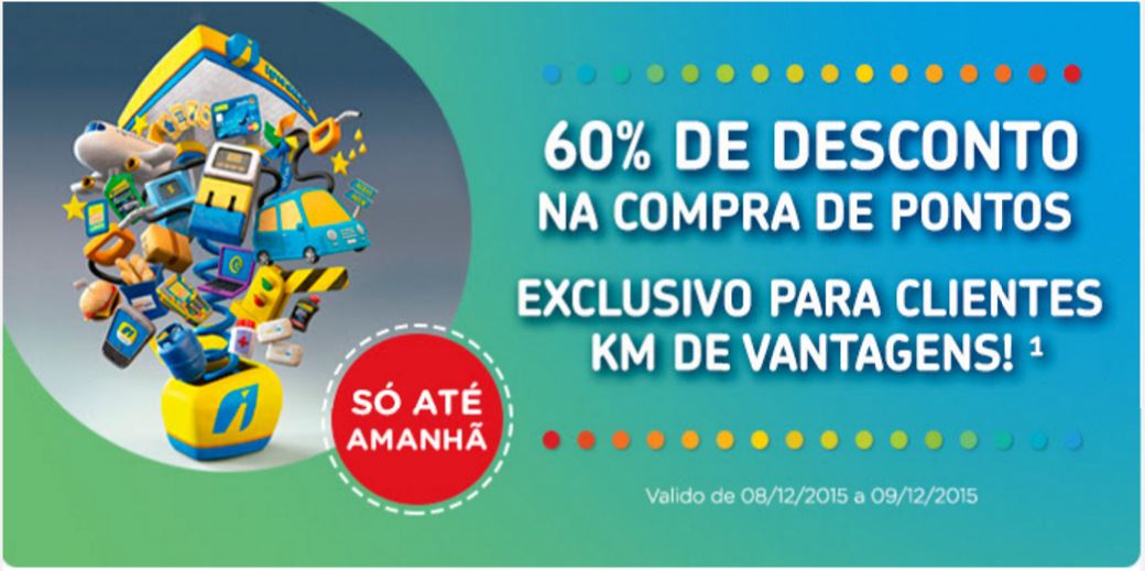 A Multiplus está dando 60% de desconto para os clientes do Km de Vantagens, mas preste atenção, para ter acesso a esse desconto é necessário ter feito alguma operação prévia entre o Multiplus e o Km de Vantagem. Essa é uma promoção escondida, pois não foi divulgada abertamente, e nem se quer montaram uma página para a mesma, sendo disponibilizado apenas um regulamento, onde está escrito que até amanhã, dia 9 de Dezembro de 2015 você poderá adquirir 50 mil pontos por 1.400 Reais o que pode ser considerado um bom negócio a depender da destinação das milhas.