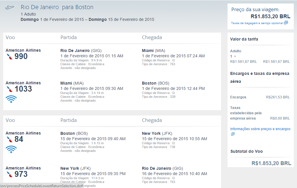 Para quem está procurando opções próxima ao carnaval, achamos passagens do Rio de Janeiro para Boston, no Estado de Massachusetts por 1.854 Reais com tudo incluso, taxas, impostos e encargos. Essa é uma excelente tarifa e conta para qualificação para o nível elite da AA. O período que conseguimos encontrar vai de 1 de Fevereiro de 2015 até 16 de Fevereiro de 2015, podendo ser flexível dentro desse período, seja para ida mais tarde, ou volta mais cedo. Com a alta do dólar, essa tarifa se torna muito interessante, e lembro que no Estado de Massachusetts não tem taxa para compras de vestuário. Portanto se te interessar vá até a página da AA e faça a busca, sendo que as mesmas podem ir se esgotando conforme a compra do público. Boa Viagem!