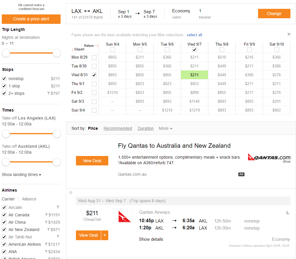 Essa é uma excelente oportunidade para quem deseja visitar a Oceania, onde o dólar da Nova Zelândia nem é tão caro, hoje em R$ 2,40. E as coisas lá nem são tão caras assim. Além do mais, quem desejar pode esticar dali para a Austrália, ou arredores. Essa é uma passagem muito boa, porque mesmo comprando dois tickets separados, você terá todos os benefícios elite do AAdvantage, já que a Qantas faz parte da OneWorld Alliance. Colocamos uma amostra de Los Angeles a Nova Zelândia acima, e a parte por Los Angeles você pode escolher as datas, desde que abarque as datas do outro trecho internacional. Boa Viagem!
