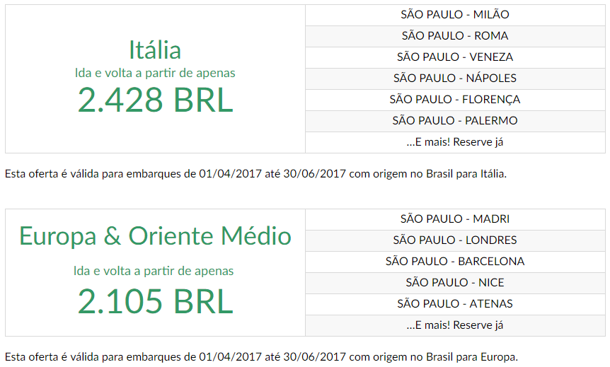 O ano de 2017 não deve estar bom para as cias aéreas, pois mal o ano começou e já estamos vendo promoções globais, e tarifas muito atrativas. No caso da Alitalia a sua promoção para quem sai do Brasil está muito melhor do que a Qatar. Veja alguns exemplos de tarifa no quadro abaixo:
