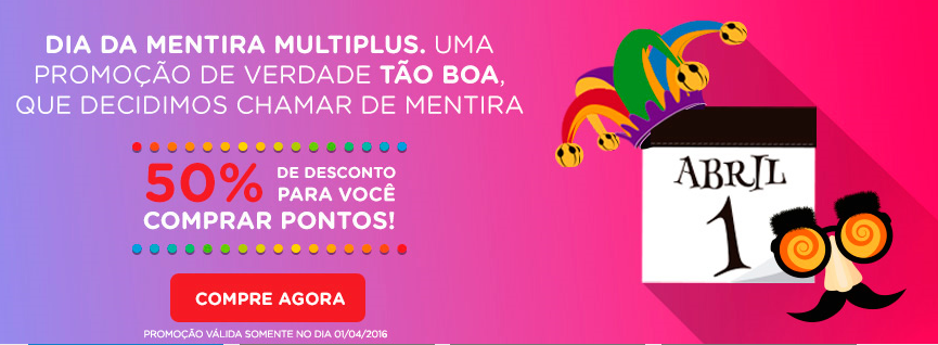 Para quem precisa completar pontos para emitir passagens essa é uma excelente oportunidade, já que são 50% de desconto para compra de pontos multiplus. Essa é uma promoção do dia da mentira, hoje, dia 1º de Abril de 2016, e termina em instantes, pois trata-se de uma promoção relâmpago. Se for do seu interesse clique no link abaixo para ser redirecionado para a página oficial da promoção. Boa Viagem!