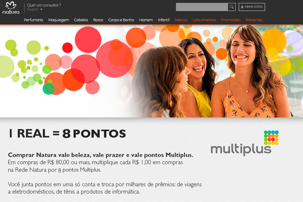 É muito engraçado que quando acontece essas super promoções os programas não divulgam nada, e depois que passa da data cantam de galo como se tivessem dado uma super oportunidade para seus clientes. Pois bem, se você já tem planos para comprar produtos da Natura ou estava pensando em comprar no futuro, recomendo analisar essa promoção, pois somente hoje e amanhã o Multiplus irá dar 8 pontos por real nas compras acima de 80 Reais, ou seja, caso você gaste 500 Reais no site receberá 4 mil pontos multiplus, o que já é suficiente para um trecho doméstico em valor promocional.