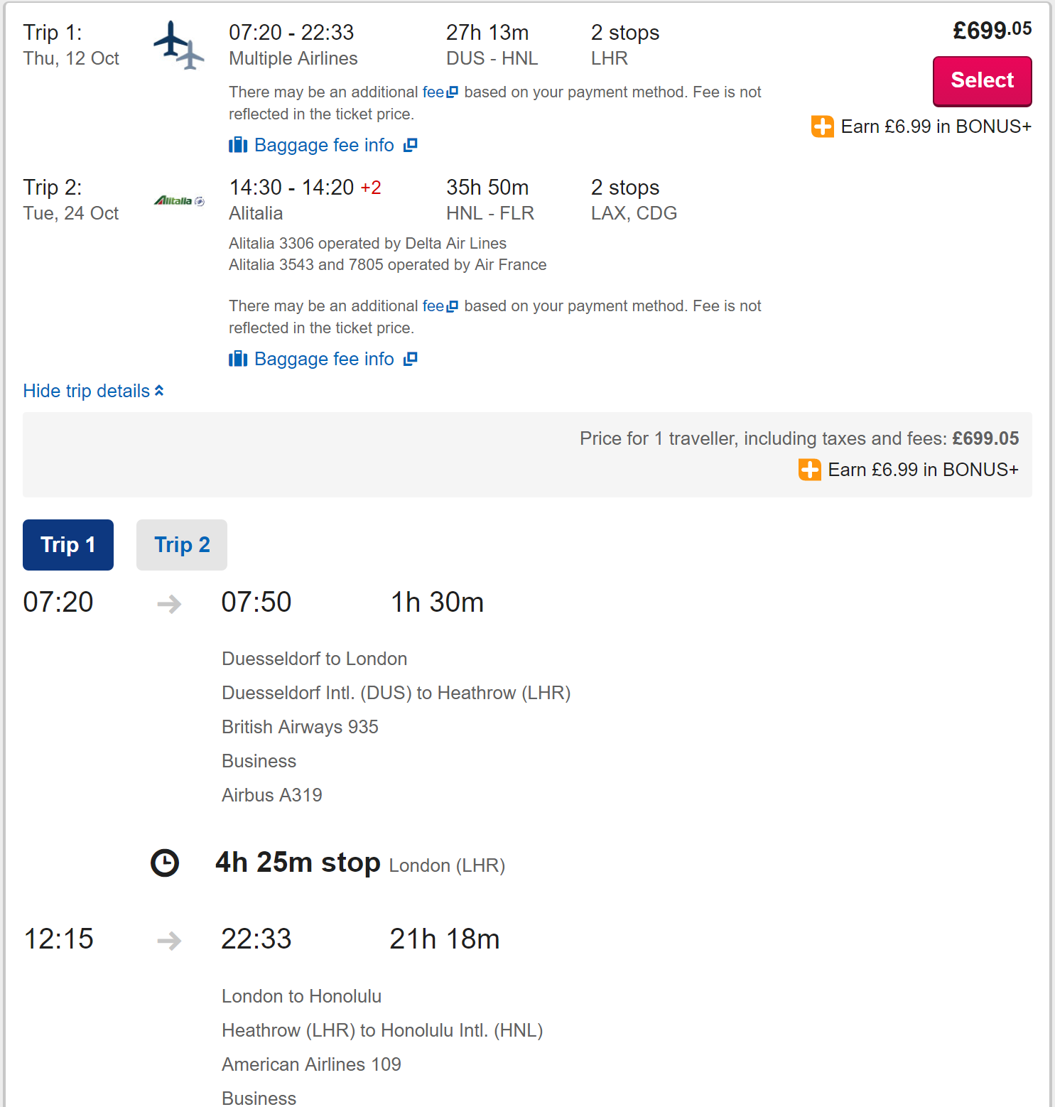 É possível achar tarifas baixíssimas da Europa para o Mundo, com a maioria das tarifas orbitando entre 2 e 5 mil Reais, todas em classe executiva já com impostos inclusos ida e volta. Por exemplo, tem uma tarifa de Florença para Melbourne e voltando para Dusseldorf de 10 a 21 de Fevereiro de 2017 por apenas 4.500 Reais, que é a mais cara. No entanto se você preferir uma viagem simples de Dusseldorf para o Honolulu somente ida e volta em executiva, você consegue a 2.900 Reais. A mais barata é Florença a Tokyo por 2.500 reais, todos os trechos em executiva. Não conseguimos achar essas tarifas no site oficial das empresas aéreas, e certamente deve ser um Bug, mas um excelente bug para quem deseja fazer milhas de qualificação viajando em classe executiva. Obviamente que existe o risco de a passagem não ser honrada, e você precisa sair e regressar para a Europa. No entanto a recomendação é sempre de compra, pois o pior que pode acontecer é cancelarem o bilhete e reembolsarem o gasto. Existem várias combinações, mas a partida e chegada devem ser majoritariamente no aeroporto de Florença, Itália e Dusseldorf, na Alemanha. As passagens já estão esgotando, recomendamos o uso do site abaixo, que foi onde encontramos as tarifas com bugs. Boa Sorte.
