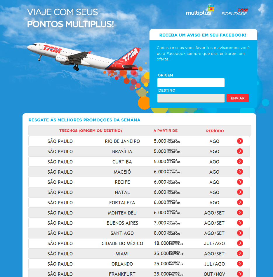 Finalmente uma boa notícia para quem utiliza o Multiplus da TAM. A partir de hoje, quem desejar poderá cadastrar em seu novo aplicativo no Facebook o seu trecho de intenção de viagem, e quando houver disponibilidade o cliente será notificado pelo próprio Facebook. Além disso, na página do aplicativo, a TAM também está colocando as melhores ofertas da semana, para que caso, seja de seu interesse, evite perda de tempo com a busca. Existem diversas reclamações do Multiplus no que se refere a disponibilidade de passagens prêmio, e parece que finalmente a TAM deu um passo rumo a transparência, de forma a facilitar o resgate das milhas dos seus clientes do Programa de Fidelidade. Não poderia deixar isso passar em branco, e devo também aqui dar parabéns publicamente a empresa por essa iniciativa, que é em benefício do consumidor. Além disso a TAM promove na página do aplicativo uma oferta de passagens prêmio promocionais, onde você pode conferir trechos para Europa por apenas 40 mil milhas e Miami por 25 mil milhas a partir de Fortaleza neste último caso. O melhor de tudo é que não se trata de um aplicativo promocional ou sazonal, e sim uma ferramenta fixa para auxiliar você na busca da melhor passagem a partir do Facebook, o que lhe evitará um maior gasto de milhas multiplus. Para ter acesso a esta ferramente é necessário ter cadastro no Facebook, pois ela é um aplicativo daquela rede social, e você pode ter acesso a mesma por meio do link abaixo. Vá lá, e quem sabe você já não sai com uma passagem pronta. Boa Viagem!