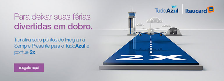 Boa notícia para os clientes dos Cartões de Crédito do Itaú. Acabou de começar a promoção de pontos em dobro quando transferir os pontos para o Tudo Azul, programa de fidelidade da Cia aérea Azul. A promoção é válida até dia 30 de Junho de 2015. Todas transações do Programa Sempre Presente serão bonificadas em 100%. Essa é uma excelente promoção considerando que devido à parceria da Azul com o Viajanet é possível emitir passagens e ainda receber milhas por elas, uma vez que você está utilizando seus pontos para pagar a passagem. Pena que existe um defeito nessa parceria, que é o fato de você poder emitir passagens originadas apenas do Brasil, o que de certa forma trava um pouco o volume de vendas da Viajanet. Seria muito bom, interessante para ambas as partes a possibilidade comprar passagens de e para qualquer lugar no mundo como é feito no Portal da AMEX Viagens e do Ponto Viagem do Itaú. Aproveite mais essa notícia em primeira mão divulgada pelo nosso site, e faça uma Boa Viagem!