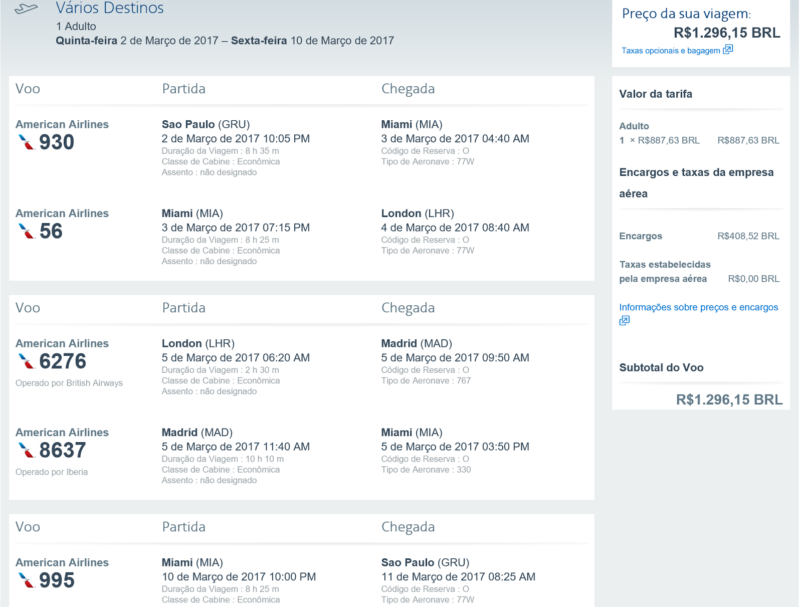 Estão acabando, as tarifas de classe O estão custando 1.293 Reais já com taxas inclusas a partir de São Paulo via Londres para Miami. Conseguimos achar um exemplo de ida no dia 2 de Março de 2017 e retorno de Londres dia 5 de Março de 2017, e então retorno de Miami dia 10 de Março de 2017, e tudo isso com taxas inclusas por 1.293 Reais, caso você queira voltar antes o valor sobre para 1.624 Reais o que ainda é um valor excelente. Nesse caso você chega em Londres dia 4 de Março, e pernoite lá, saindo então no dia seguinte, dia 5 de Março de 2017 chegando em Miami no mesmo dia. A medida que as pessoas vão comprando as passagens a tarifa de classe “O” se transforma em “Q” e a passagem fica mais cara algo em torno de 400 Reais, o que ainda é atrativo. Obviamente nesse caso não recomendo o crédito de milhas no AAdvantage, mas sim no Latam Fidelidade, que já vai te dar a categoria GOLD com essa viagem, e metade da qualificação para atingir o nível Platinum. As datas estão aí, e a captura de tela abaixo. Sugiro que comprem logo, pois não vai durar muito, e os assentos são limitados. Boa Sorte e Boa Viagem.