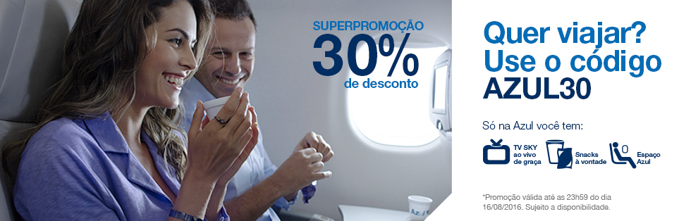URGENTE: AZUL DÁ DESCONTO DE 30% NAS PASSAGENS ATÉ 23H59 DE HOJE DIA 16/08
