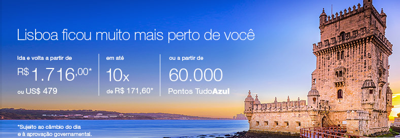 A Azul começa bem a operar sua nova rota para Lisboa. A empresa está oferecendo um excelente preço a partir de 1.716 Reais que ainda podem ser divididos em 10 vezes de 171,60 Reais. Um valor muito bom, com uma ótima condição de parcelamento. Para participar dessa promoção no entanto você deve emitir seu bilhete até o dia 3 de maio de 2016, para viagens a serem realizadas entre 22 a 30 de junho de 2016, ou 19 de julho a 18 de agosto de 2016, ou ainda 6 de setembro a 30 de novembro de 2016. Esse valor na verdade foi calculado com o câmbio de 3,58 reais, logo deve estar abaixo de 1.700 Reais caso você decida comprar hoje ou amanhã. Vale muito a pena, e você pode enviar os pontos para o programa Tudo Azul ou Mileage Plus da United. Não perca essa oportunidade. Boa Viagem!