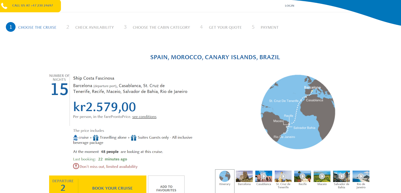 Não costumo divulgar aqui questões acerca de cruzeiros, porém essa oferta me chamou muito atenção, pois quem tem vontade de fazer essa experiência pode emitir uma voo só de ida para a Europa e voltar de navio de lá. Não sei até quando isso vai durar, e não parece ser erro, e sim um valor promocional mesmo. São 15 noites a bordo do navio Costa Fascinova, e sai do porto de Barcelona passando por Casablanca no Marrocos, Santa Cruz de Tenerife, Recife, Maceió, Salvador, e por fim a cidade maravilhosa do Rio de Janeiro. O valor inclui a alimentação a bordo, e todas as taxas. Como o site é Norueguês, a moeda cobrada será em Coroa Norueguesa, que no final das contas irá equivaler a 1.000 Reais, o que vale muito a pena. Infelizmente na data do cruzeiro estarei em viagem, caso contrário, certamente estaria lá. Caso isso lhe interesse, aproveite enquanto há tempo, e clique no link abaixo para ser redirecionado para o site oficial da oferta. Boa Viagem.