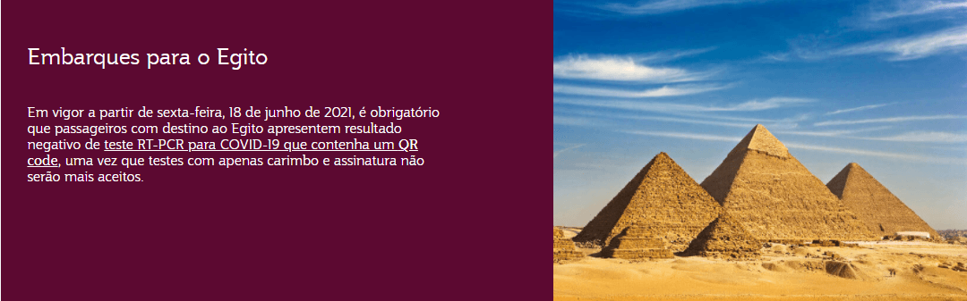 A novidade é a apresentação do QR code para validação junto a cia aérea. Como o Egito é um dos poucos destinos abertos a Brasileiros, pode ser que muitos sejam pegos de surpresa com essa notícia.