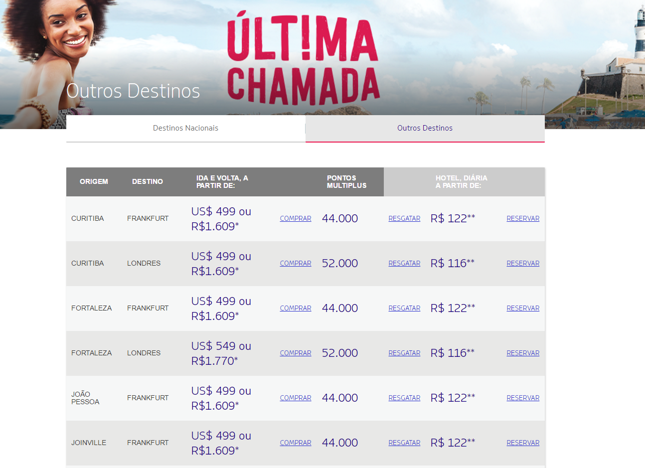 A Latam acaba de lançar uma promoção tipo feirão de passagens denominada “Última Chamada” com preços incríveis, sendo que o melhor de tudo é o acúmulo de milhas. É bom você saber que apenas uma ida e volta para a Europa te leva ao nível elite GOLD, que realmente não é lá grandes coisa, mas já é algo, e quem puder fazer isso para chegar no Platinum aí sim vale muito a pena, pois a partir desse nível quaisquer voos na Latam pontuam em dobro. Essa promoção terá duração somente até às 8 da manhã do dia 10 de Outubro de 2016. Agora recomendo a todos a visitarem a página oficial primeiro, pois cada destino tem um período específico para voo, e também para ver a super lista de origem e destino da viagem. A Latam arrebentou dessa vez, pois é difícil ver preços tão atrativos para tantos destinos na Europa como diversas origens no Brasil. Não percam essa oportunidade, e lembrando também que a promoção é de milhas e tarifas, logo não está difícil fazer essa chance brotar. Boa Viagem.