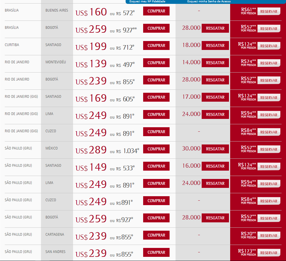 A LATAM acaba de lançar uma mega promoção do Brasil para toda a América Latina, somente até às 8 da manhã da próxima segunda dia 18 de Abril de 2016. Tem valores muito atrativos, como por exemplo RJ/SP para Cuzco por menos de 900 Reais ida e volta. Essa é uma excelente oportunidade para visitar esses lugares, e se quiser acumular milhas não viaje, pois o código dessa tarifa não permite o acúmulo de milhas na maioria dos programas parceiros, mas no LATAM Fidelidade permite ao menos alguns pontos. Ao lado das tarifas promocionais a TAM está oferecendo também diárias de hotéis bem em conta. Acho que essa mega promo ficou muito boa. Não perca. Se for do seu interesse basta clicar no link abaixo. Boa Viagem!