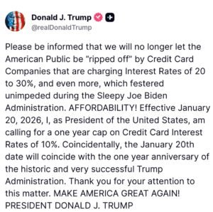 O Presidente Donald Trump acaba de anunciar em sua rede Truth Social que a partir de 20 de janeiro de 2026 nenhum cartão de crédito americano poderá cobrar juros acima de 10% ao ano pelo período de 1 ano, o que equivalerá a um máximo de 0,83% ao mês.