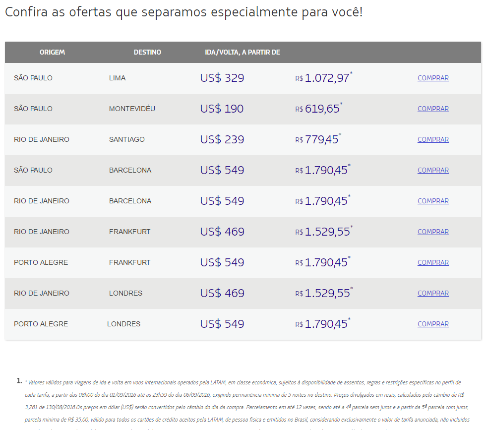 A Latam acaba de lançar uma promoção agressiva tanto de classe econômica, como classe executiva, seguindo a promoção da KLM e Air France. São vários destinos na Europa, todos abaixo dos 2 mil reais na passagem de ida e volta já com taxas inclusas. O bom de você voar na Premium Business da Latam é a facilidade de acumular milhas no AAdvantage, pois você recebe 125% da distância voada tanto para resgate como para qualificação, o que ainda é atrativo no programa da American durante este ano, ou você pode ir para o Latam Fidelidade que somente nesse voo, mesmo sendo em classe econômica, você já recebe o status GOLD, o que já irá te dar 25% de milhas bônus nos seus voos até Março de 2018. Então do ponto de vista dos pontos vale muito a pena essas passagens, e para quem quer combinar com os feriados que estão por vir melhor ainda. Alguns requisitos dessa promoção é a permanência mínima de 5 noites no destino, e emissão da passagem até às 23h59 de amanhã, dia 6 de Setembro de 2016. Não perca essa chance e clique no link abaixo para ver a lista completa de promoções no site oficial da Latam. Boa Viagem.
