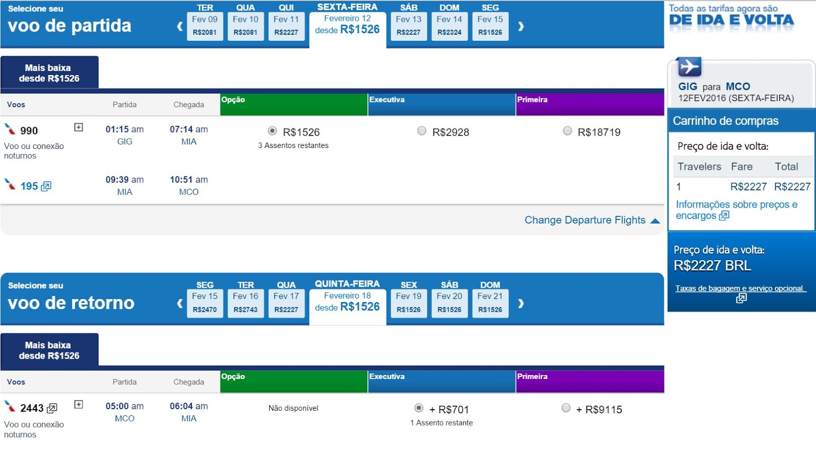 Antes de propriamente falar sobre a tarifa é importante relembrar de que quando coloco preços aqui, os mesmos já incluem todas as taxas, impostos e encargos de forma a divulgar o valor final para facilitar o seu planejamento. Vamos lá, durante os meses de Fevereiro, março e Abril é possível achar Rio – Orlando em Classe executiva por 2.928 REAIS Ida e volta ou 2.227 em Classe mista (Ida ou volta em econômica). Claro que nesse cenário é melhor comprar tudo em Executiva, em virtude das promoções prorrogadas e bônus que ainda estarão vigentes no primeiro semestre, bem como o novo sistema de qualificação. Essa é uma oportunidade muito boa de acumular milhas ante a mudança do programa a ser implementada na metade do segundo semestre de 2016. É bom lembrar também que ainda é possível parcelar esse valor em até 5x sem juros em todos os cartões de crédito, e principalmente que para quem tem o Citicard ainda tem 20% de desconto devido a promoção do Citi, ou seja, se você pagar sua passagem com o Citicard o valor final será em torno de 2.400 Reais. Como disse é uma excelente oportunidade não só para ir a Orlando em classe Executiva, mas também acumular muitas milhas antes da mudança do programa. Colocamos duas amostras, porém é possível achar para outros dias. Aproveite e Boa Viagem!
