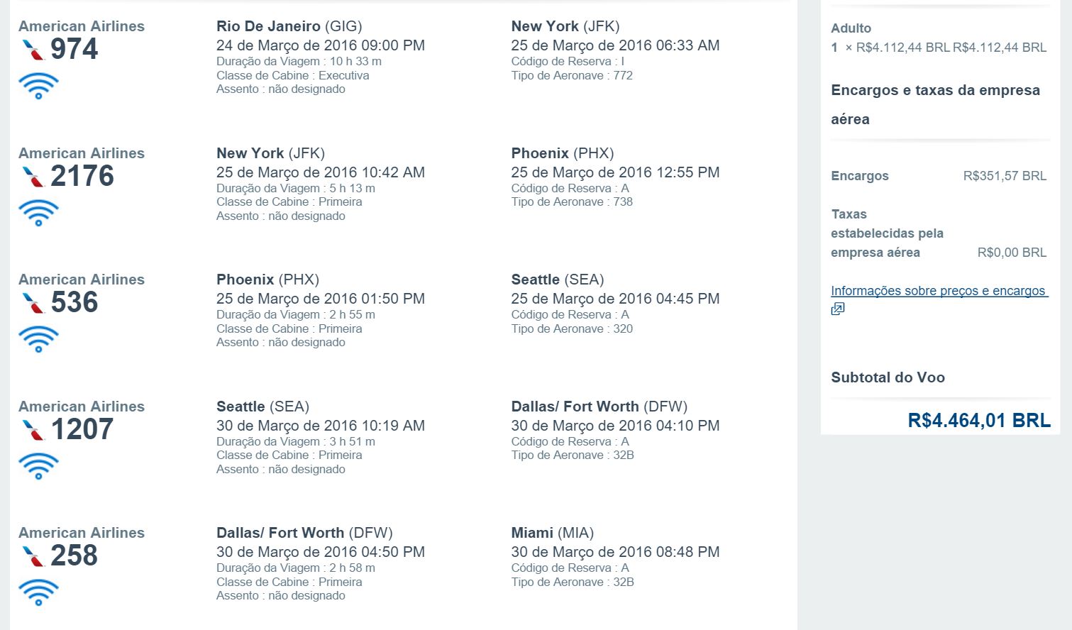 Mais uma super promoção da American, assim como Orlando, Seattle está na promoção de executiva a 4.465 Reais, sendo que quem comprar até o dia 15 de Dezembro com o cartão de crédito do Citibank sai a 3.650 Reais, que podem ser divididos em até 5x sem juros. Olhando essa tarifa eu tracei o seguinte roteiro RIO – JFK – PHX – SEA – DFW – MIA – GIG, que não fica muito cansativo, e nem é preciso acordar muito cedo para voltar de Seattle. Mas vamos a matemática elementar que esse itinerário irá produzir: