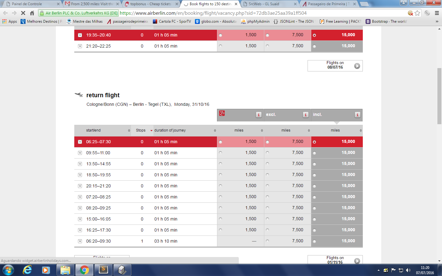 Você que tirou proveito daquela promoção da Air Berlin, que ao indicar amigos, poderia receber até 10 mil pontos pode agora emitir seus bilhetes em combinação com outra promoção da cia aérea, onde é possível encontrar trechos a 1.500 pontos. Eu irei aproveitar, pois consegui uma boa passagem pra Europa e como chego perto de Munique, irei emitir uma ida e volta para Berlin utilizando esses pontos “gratuitos”. Veja abaixo alguns trechos promocionais, sendo que nosso leitor que passou a dica ainda indicou Cologne a Berlin por 1.500 milhas, que ele achou, e pode ser conferido na imagem ao lado. Boa Viagem!
